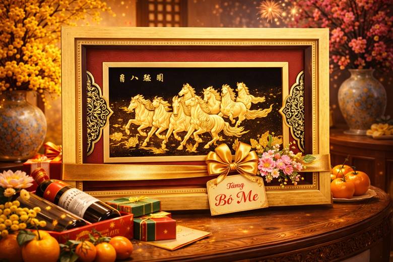 Nếu bố mẹ chồng vẫn đang tham gia các hoạt động xã hội hoặc kinh doanh, tranh ngựa (Mã Đáo Thành Công) là món quà "trúng tim đen". Hình ảnh những chú ngựa mạnh mẽ phi nước đại trên nền vàng lá 24K biểu trưng cho sự hanh thông, tài lộc dồi dào. Tặng món quà này, nàng dâu khéo léo gửi gắm thông điệp: "Con chúc bố mẹ năm mới mọi sự đều thuận buồm xuôi gió, mã đến là thành công".
