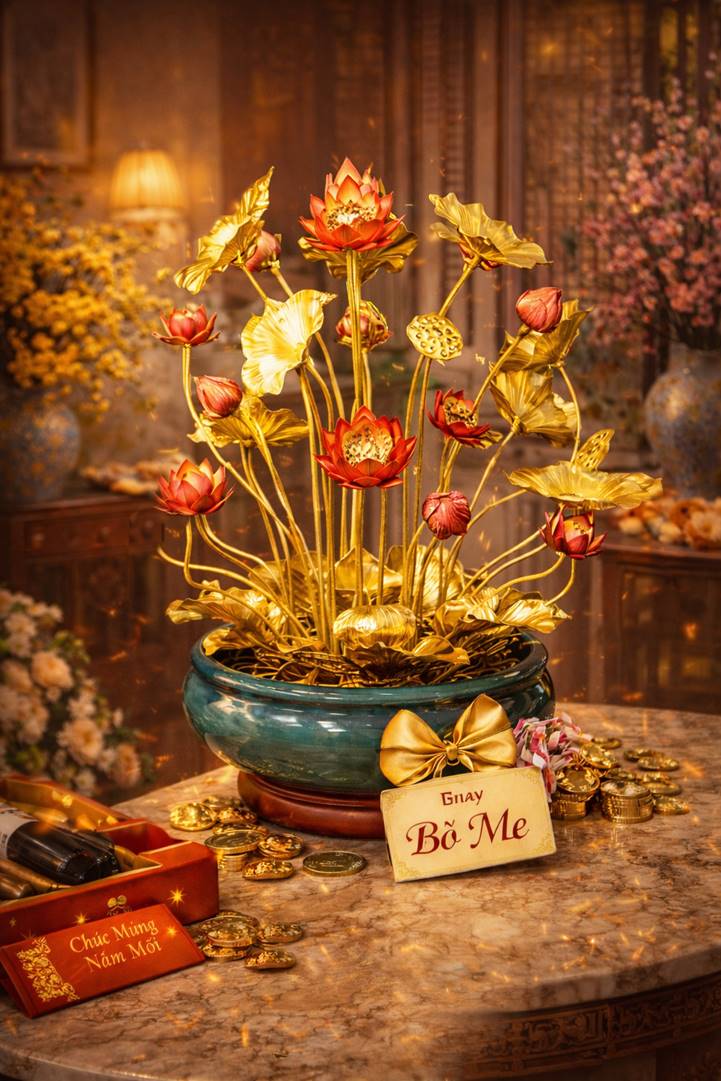 Mẹ vợ "nữ vương" của gia đình luôn dành một vị trí trang trọng nhất trong phòng khách cho những vật phẩm nghệ thuật. Những đài Sen thanh khiết được chế tác tỉ mỉ, khoác lên mình lớp vàng 24K óng ả, tạo nên một vẻ đẹp "kiêu sa mà không chói lóa".