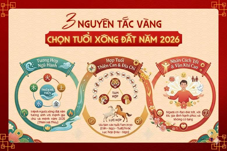 Năm 2026 mang nạp âm Thiên Hà Thủy. Để dòng nước từ trời này mang lại sự sinh sôi thay vì sự tàn phá, người xông đất nên là người có bản mệnh tương sinh hoặc tương hỗ với gia chủ và năm mới. Do đó, khi chọn tuổi xông đất năm 2026, gia chủ cần tuân theo quy luật Ngũ hành ưu tiên sự tương sinh.