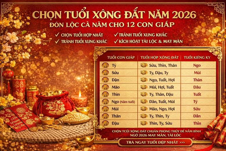 Chọn tuổi xông đất năm 2026 cho 12 con giáp chuẩn theo phong thủy sẽ giúp gia chủ may mắn, rước tài lộc cả năm. Tết đến vừa là thời khắc chuyển giao năm cũ – năm mới. Vừa là lúc mỗi gia đình Việt đặc biệt coi trọng những nghi lễ đầu xuân nhằm mở ra một năm hanh thông, thuận lợi.