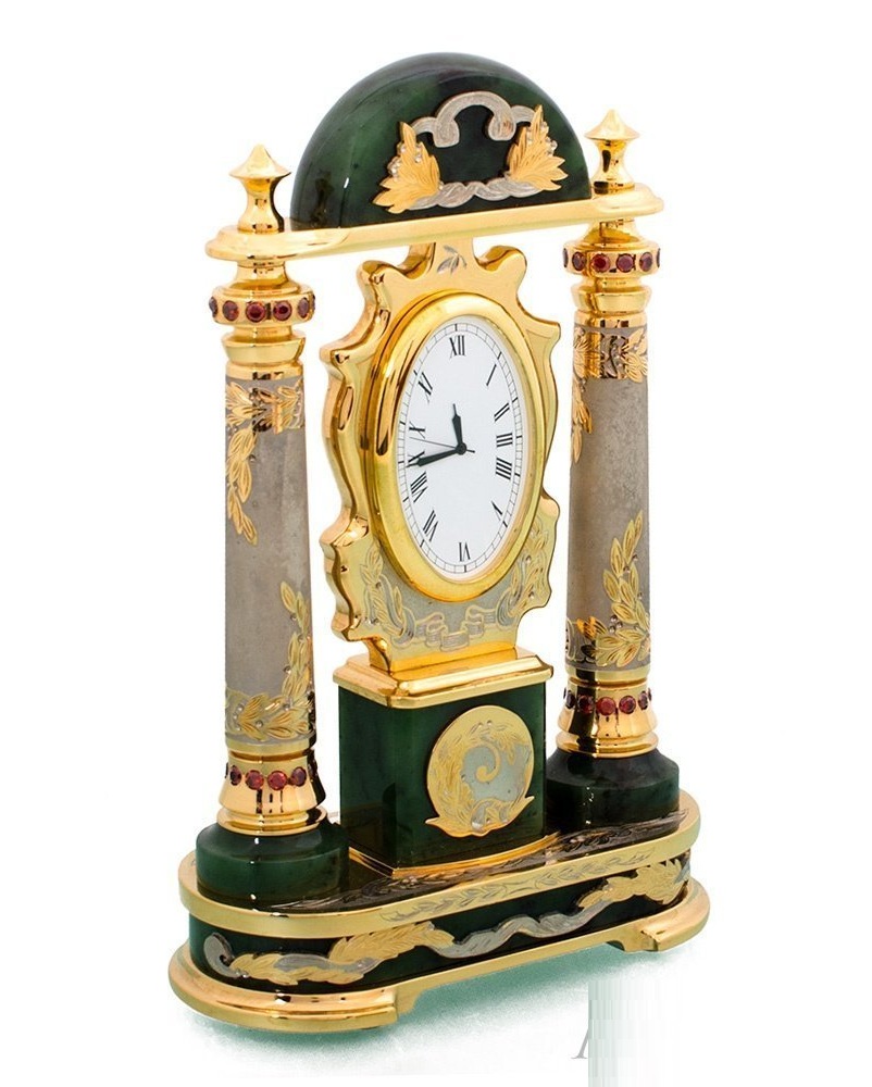 Đồng hồ để bàn vĩnh cửu “Jade” đá quý tự nhiên mang đậm hơi thở của kiến trúc Tân Cổ Điển uy nghi toát lên một vẻ sang trọng vương giả hiếm có, nhờ vào sự kết hợp hài hòa giữa kim loại quý được mạ vàng tinh xảo và vật liệu đá quý ngọc bích tự nhiên cao cấp chế tác theo kỹ thuật truyền thống của nước Nga.