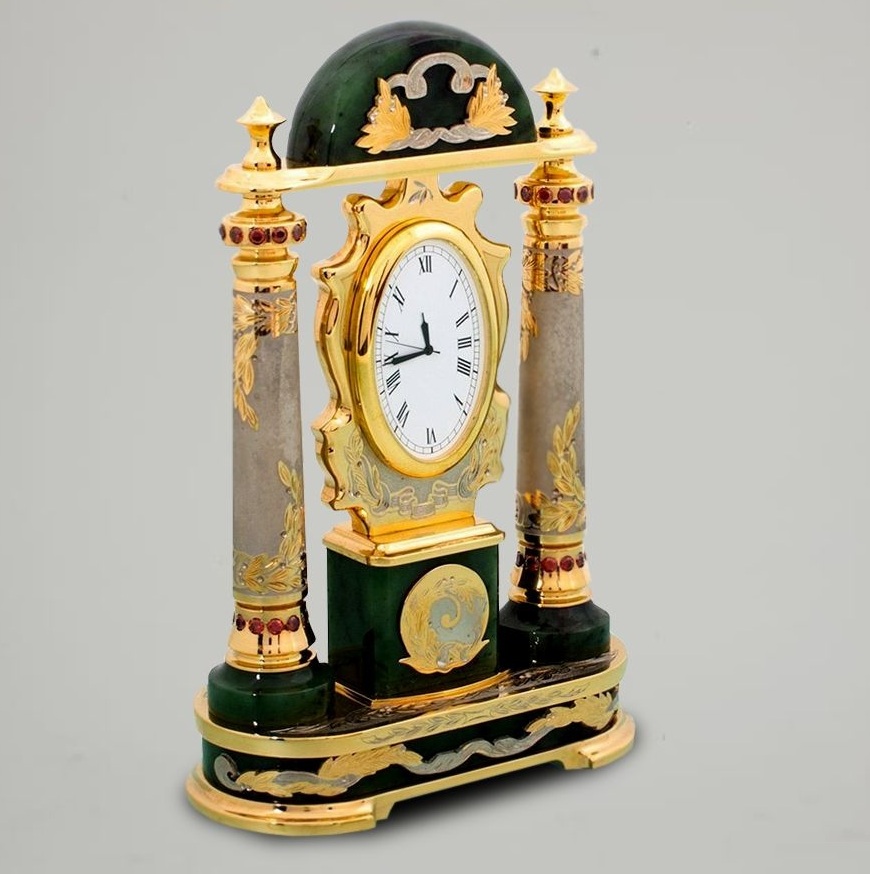 Đồng hồ để bàn vĩnh cửu “Jade” đá quý tự nhiên được sản xuất tại Nga. Nơi nghệ thuật khắc kim loại Zlatoust vẫn được duy trì và phát triển đến ngày nay. Đây là món quà lý tưởng dành cho những ai yêu thích sự tinh tế, đẳng cấp và muốn sở hữu một vật phẩm mang giá trị văn hóa – lịch sử sâu sắc.