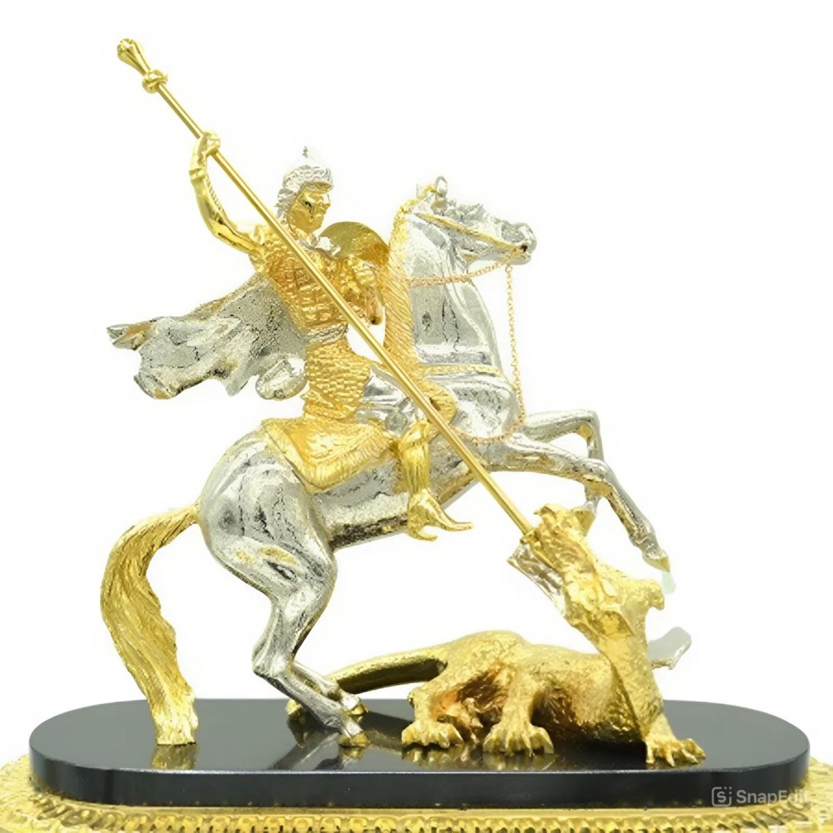 Thiết kế tượng Thánh George diệt rồng là điểm nhấn nghệ thuật đầy khí chất, tái hiện sống động một khoảnh khắc huyền thoại vị hiệp sĩ được khắc họa trong bộ áo giáp lấp lánh. Từng đường nét phản chiếu ánh sáng như tỏa ra hào quang của chính nghĩa. Chiếc áo choàng tung bay sau lưng không chỉ tạo cảm giác chuyển động mạnh mẽ, mà còn thể hiện khí chất anh hùng, sẵn sàng xông pha vào trận chiến.