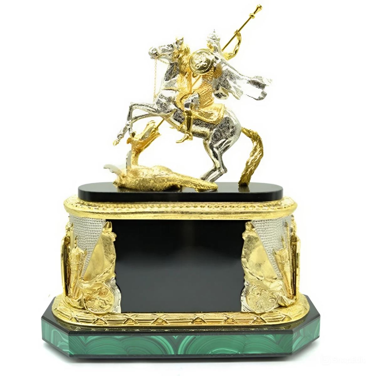 Toàn bộ bức tượng được đặt trên một bệ đỡ đồ sộ và lộng lẫy, kết hợp hoàn hảo giữa vật liệu thiên nhiên và nghệ thuật chạm khắc kim loại. Phần đế được chế tác từ đá malachite xanh ngọc sang trọng và dolerite đen huyền bí. Hai loại đá tự nhiên nổi tiếng với độ bền và vẻ đẹp độc đáo. Tượng hiệp sĩ và các chi tiết như giáo, khiên, vòng nguyệt quế được đúc bằng đồng mỹ thuật, mang lại độ sắc nét và chiều sâu nghệ thuật vượt trội.