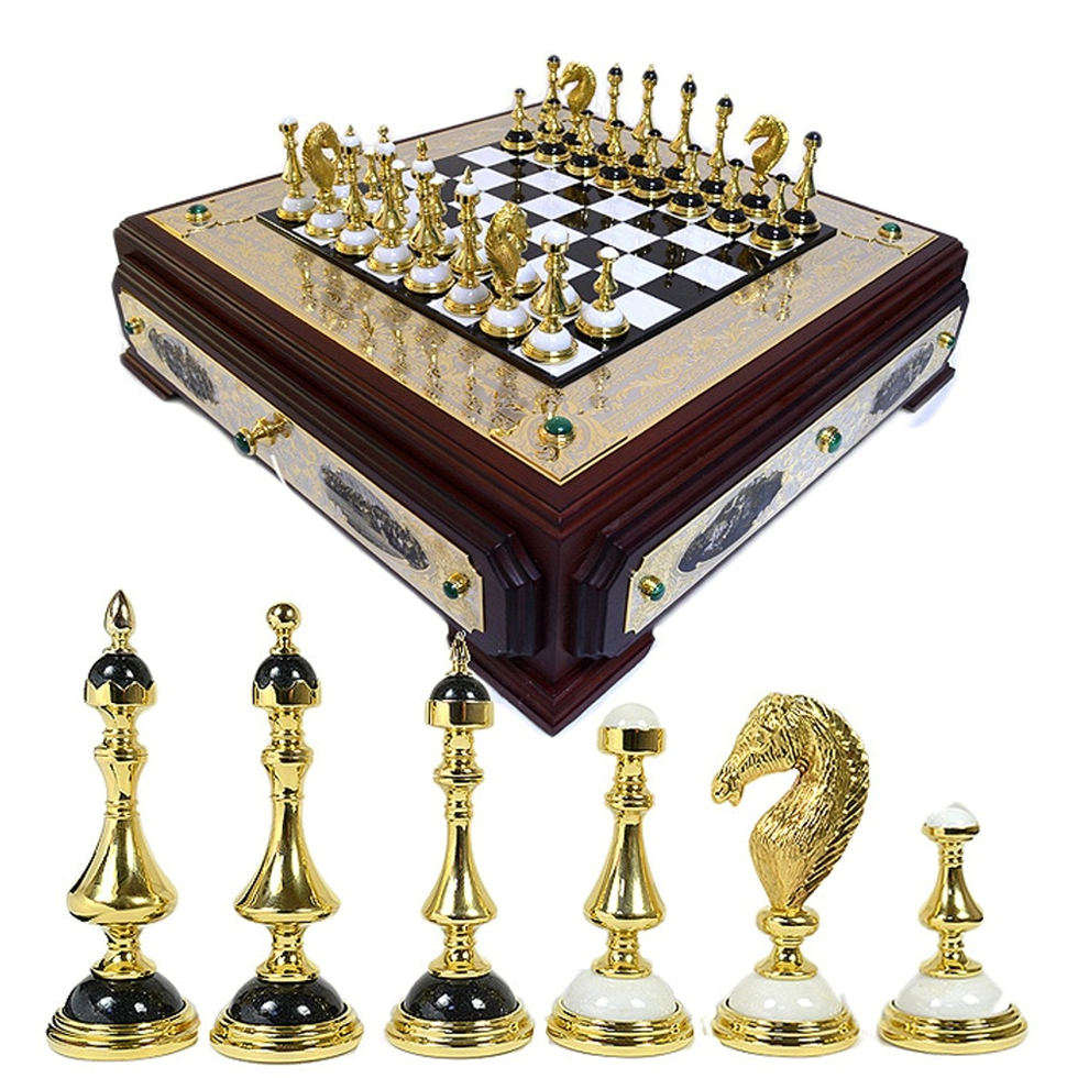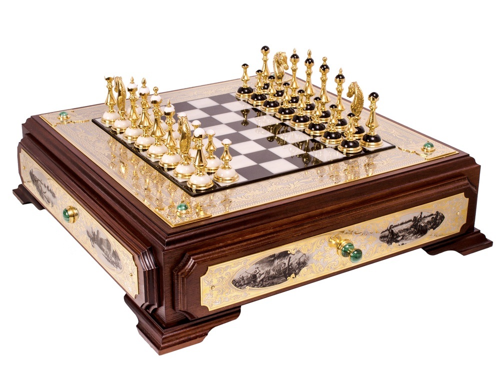 Điểm nổi bật nhất chính là nghệ thuật Zlatoust, một kỹ thuật trang trí kim loại nổi tiếng của Nga, được áp dụng nguyên bản lên từng quân cờ. Quá trình chế tác bao gồm các công đoạn phức tạp như mạ vàng 24K, làm đen thủ công, mạ niken sáng bóng. Đặc biệt là khảm đá malachite có màu xanh lục đặc trưng, tượng trưng cho sự thịnh vượng và trí tuệ.