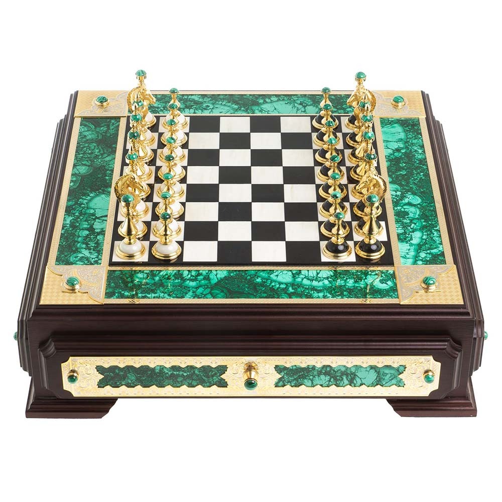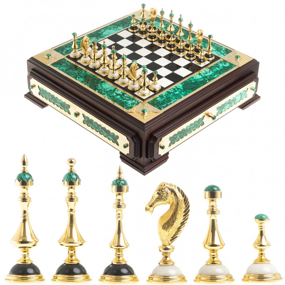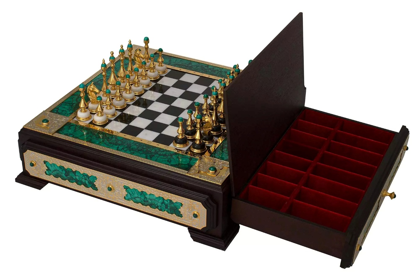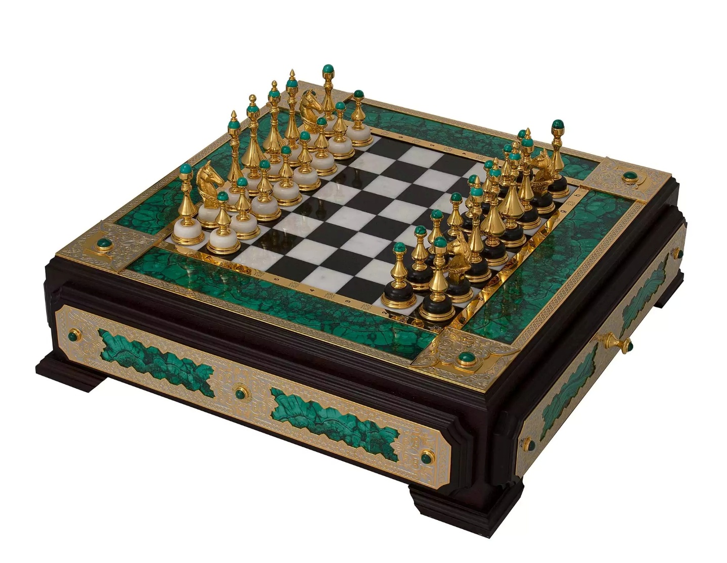Bước vào thế giới của những vị vua với bộ cờ vua hoàng gia đá Malachite. Một tuyệt tác nghệ thuật được sinh ra để tôn vinh trí tuệ và quyền lực. Không chỉ là một trò chơi, bộ cờ độc đáo này là một biểu tượng. Những quân cờ mạ vàng lộng lẫy và đá Malachite xanh thẳm huyền bí giao chiến trên chiến trường đen trắng của sự tính toán.