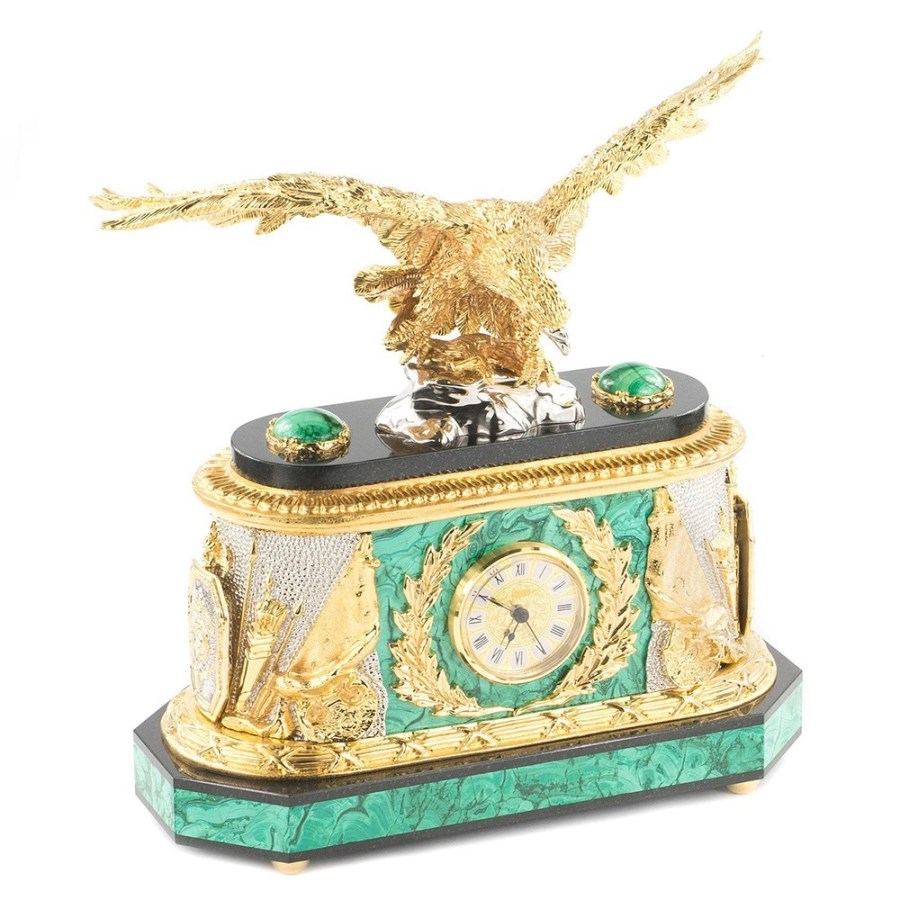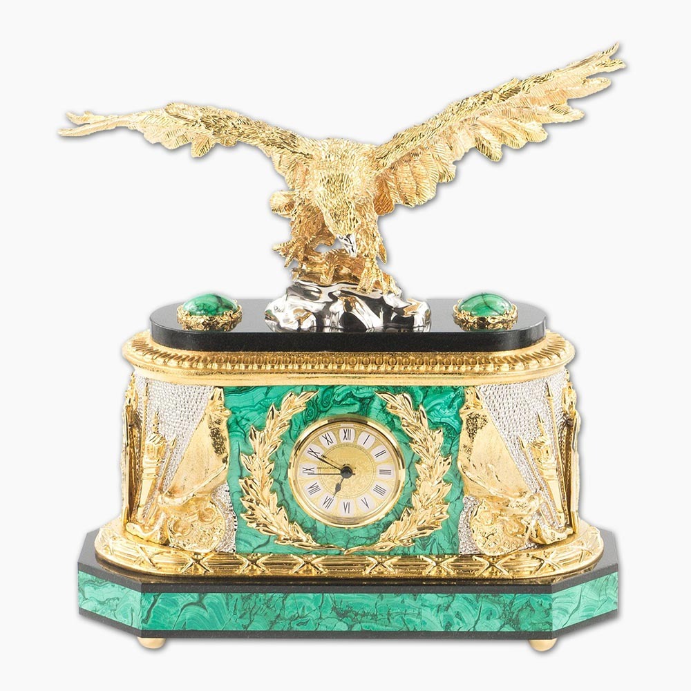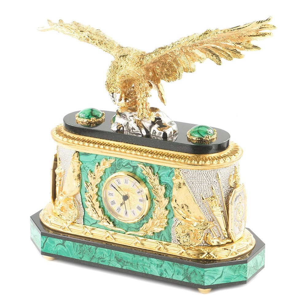 Hình ảnh đại bàng dang rộng đôi cánh kiêu hãnh trên đỉnh, được chế tác tinh xảo từ kim loại quý và điểm xuyết đá lấp lánh. Chiếc đồng hồ không chỉ là vật trang trí mà còn là lời nhắn gửi đầy tâm tư. Phần thân được ốp đá xanh sang trọng, kết hợp với các chi tiết mạ vàng và hoa văn cổ điển, tạo nên vẻ đẹp vừa uy nghi vừa sâu lắng.