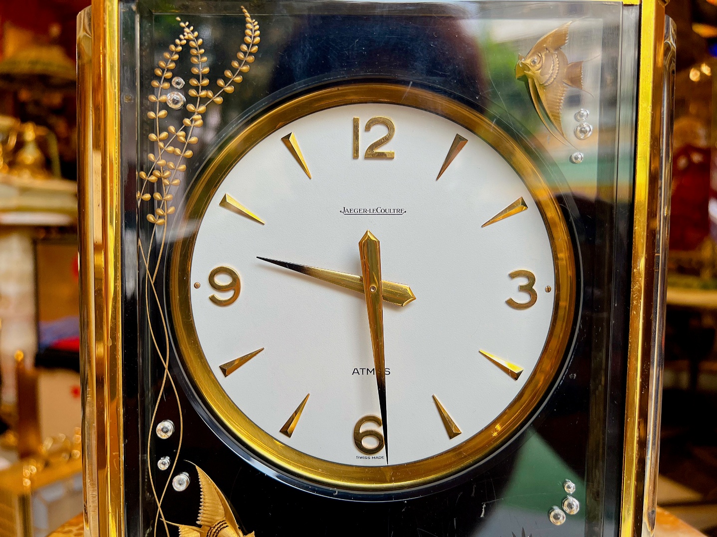 Họa tiết cá vàng độc quyền là chi tiết làm nên giá trị của mẫu Marina. Những họa tiết cá vàng, rong biển, bọt nước được nghệ nhân khắc sâu và mạ vàng lên các mặt kính, tạo ra hiệu ứng 3D đầy chiều sâu. Toàn thân được mạ vàng 24K, Atmos Marina không chỉ là một món đồ xa xỉ mà còn là biểu tượng của sự trường tồn, tinh tế và đẳng cấp vượt thời gian.