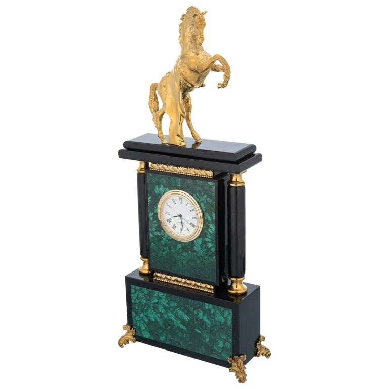 Thế giới phong thủy và nghệ thuật trưng bày cao cấp, có những món đồ không chỉ mang giá trị sử dụng mà còn là biểu tượng của quyền lực, sự thịnh vượng và khát vọng vươn lên. Một trong số đó chính là đồng hồ đá phong thủy Ngựa Quý. Tuyệt phẩm kết hợp giữa nghệ thuật chế tác tinh xảo và ý nghĩa phong thủy sâu sắc. Chiếc đồng hồ tạo ấn tượng mạnh mẽ ngay từ cái nhìn đầu tiên nhờ vào chất liệu đá chủ đạo: Ngọc Malachite xanh tự nhiên.