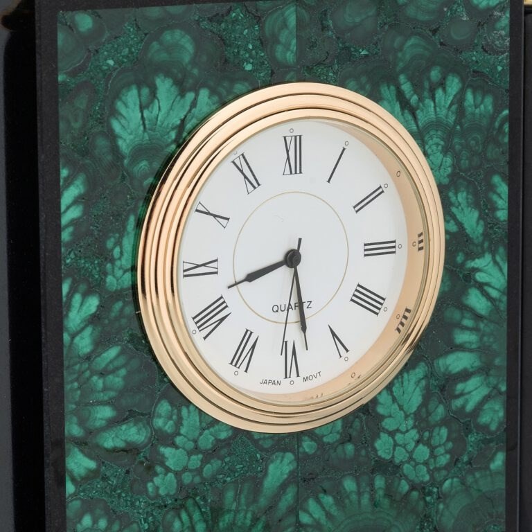 Điểm nổi bật khiến chiếc đồng hồ này trở thành món đồ sưu tầm đắt giá chính là chất liệu đá ngọc malachite xanh tự nhiên. Loại đá phong thủy quý hiếm được biết đến với khả năng thu hút năng lượng tích cực, xua tan tà khí và mang lại sự cân bằng trong không gian.