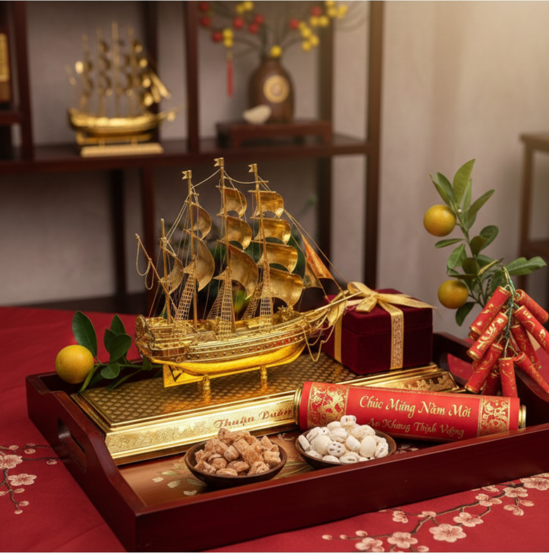 Nếu tranh treo tường là sự tinh tế thì mô hình thuyền buồm đặt bàn là sự khẳng định quyền uy. Được dát vàng 24k sang trọng, từng chi tiết từ dây buồm đến mỏ neo đều đạt độ hoàn thiện tuyệt đối.