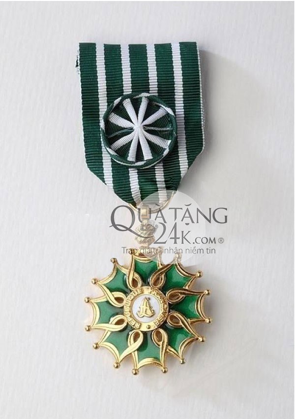 Nổi bật trên nền trắng tinh khôi là chữ “A” mạ vàng viết tắt của “Arts” (nghệ thuật), được bao quanh bởi dòng chữ “Ordre des Arts et des Lettres”. Gợi nhắc đến một trong những huân chương danh giá nhất của Pháp. Dây ruy băng được gấp tam giác truyền thống, kết hợp màu sắc trang nhã, tạo cảm giác trang trọng và cổ điển, phù hợp với cả lễ phục lẫn trang phục hiện đại.
