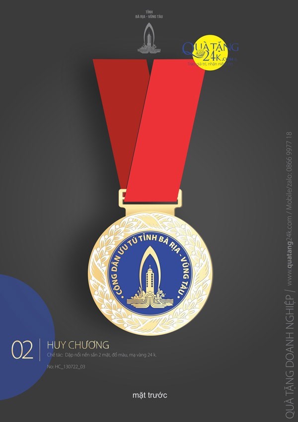 Mặt trước nổi bật với phần trung tâm là biểu tượng đặc trưng của Tỉnh Bà Rịa - Vũng Tàu, được bao quanh bởi dòng chữ "CÔNG DÂN ƯU TÚ TỈNH BÀ RỊA - VŨNG TÀU" cùng họa tiết vòng nguyệt quế tinh xảo. Sự kết hợp giữa nền vàng óng ánh, chi tiết chạm khắc sắc nét và dây đeo màu đỏ truyền thống tạo nên một tổng thể hài hòa, trang trọng.